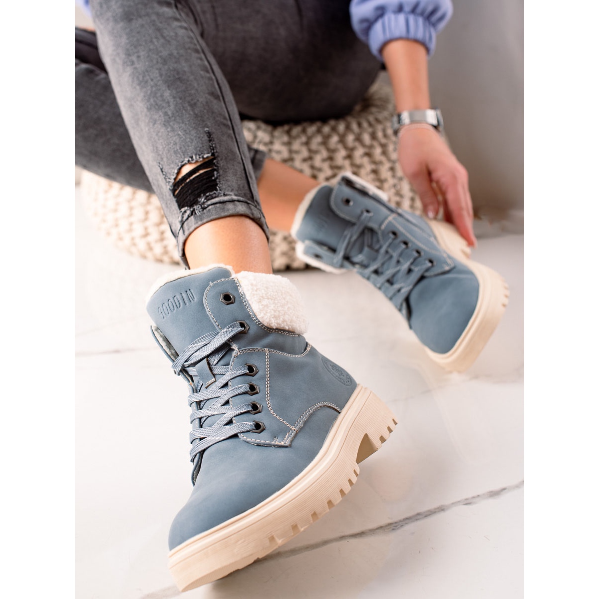 Entdecken Sie einzigartigen Stil und Tragekomfort dank Goodin-Wanderstiefeln. Diese beige-blauen Damenstiefeletten sind die perfekte Wahl für kältere Tage und kombinieren modisches Design mit praktischen Lösungen. Sie bestehen aus hochwertigem ökologischem Leder, was sie nicht nur umweltfreundlich, sondern auch äußerst bequem macht.