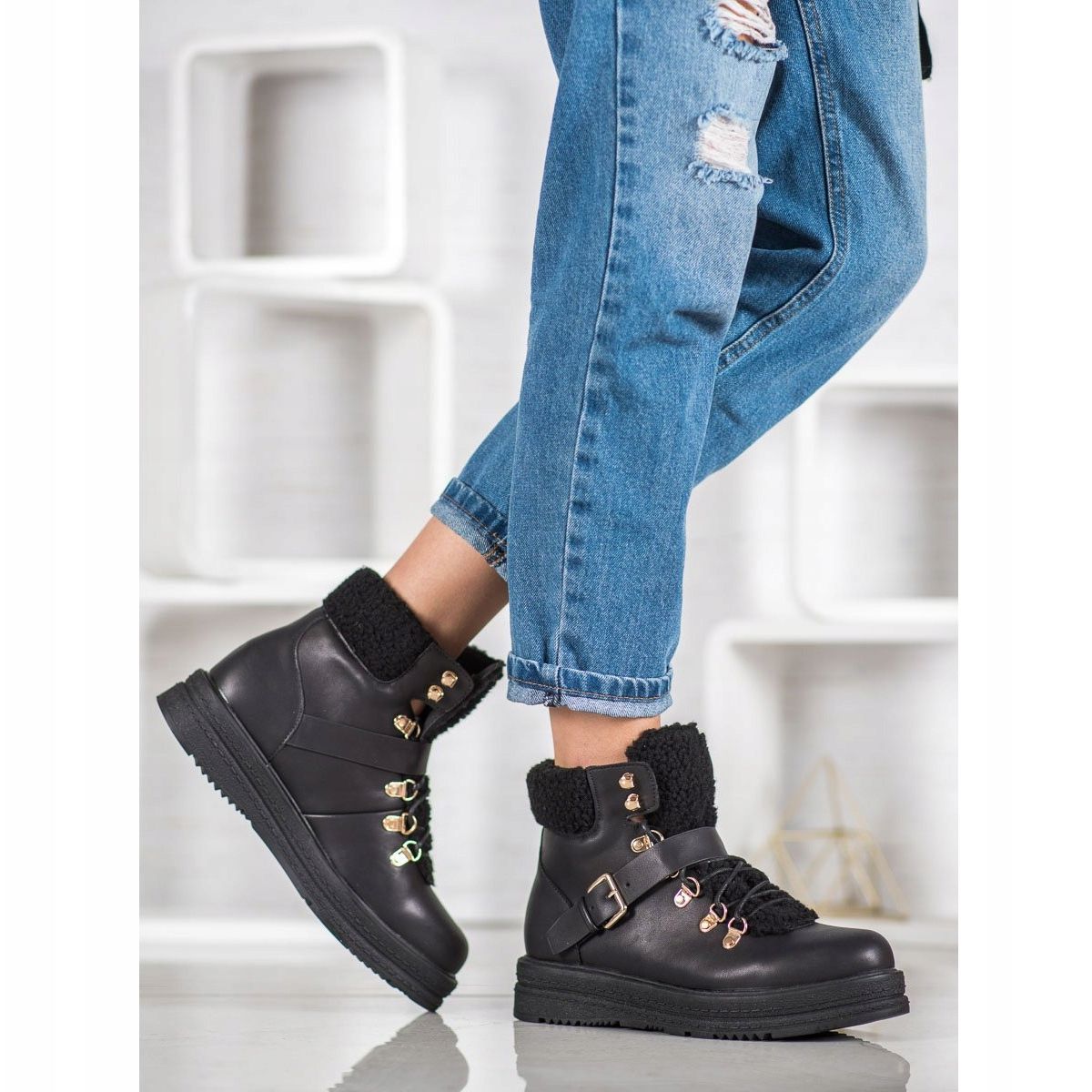 Die Stiefel verfügen über eine Schnürung, wodurch sie sich perfekt an die Fußform anpassen lassen und so für Tragekomfort sorgen. Mit einem Schaffellmantel am Obermaterial und einer dekorativen Schnalle befestigt, ziehen sie die Blicke auf sich und verleihen jedem Styling Charakter. Die Sohle mit Profil sorgt für Stabilität und Komfort beim Gehen und die Absatzhöhe von 3-5 cm ermöglicht eine langfristige Nutzung ohne Ermüdungsgefühle.