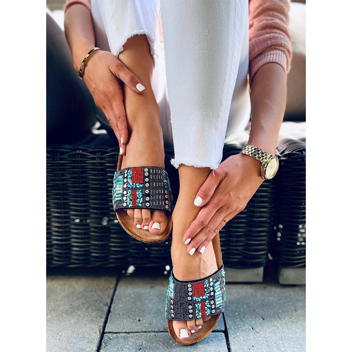 Taida Black Kork-zehenstegsandalen in Schwarz sind eine ausgezeichnete Wahl für Frauen, die Wert auf Komfort und einen modischen Look legen. Aus hochwertigem ökologischem Wildleder gefertigt, sieht dieses Modell äußerst elegant aus und eindrucksvolle Verzierungen im Ethno-Stil verleihen ihm einen einzigartigen Charakter.