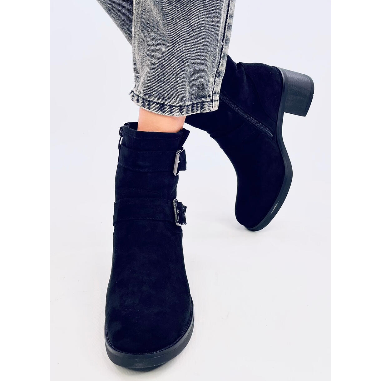 Stylische schwarze Teo -schwarze Stiefel sind die perfekte Kombination aus Komfort und modischem Erscheinungsbild. Sie bestehen aus einem angenehmen ökologischen Wildleder mit einem isolierten Innenraum mit zartem Fell und bieten an kühleren Tagen Wärme und Komfort. Eine stabile, breite Heel mit einer Höhe von 6,5 cm erhöht eine Gewissheit, und der praktische Reißverschluss auf der Seite erleichtert das Anziehen. Der Charakter wird durch effektive Schnallen angegeben, die den modernen Schnitt betonen.