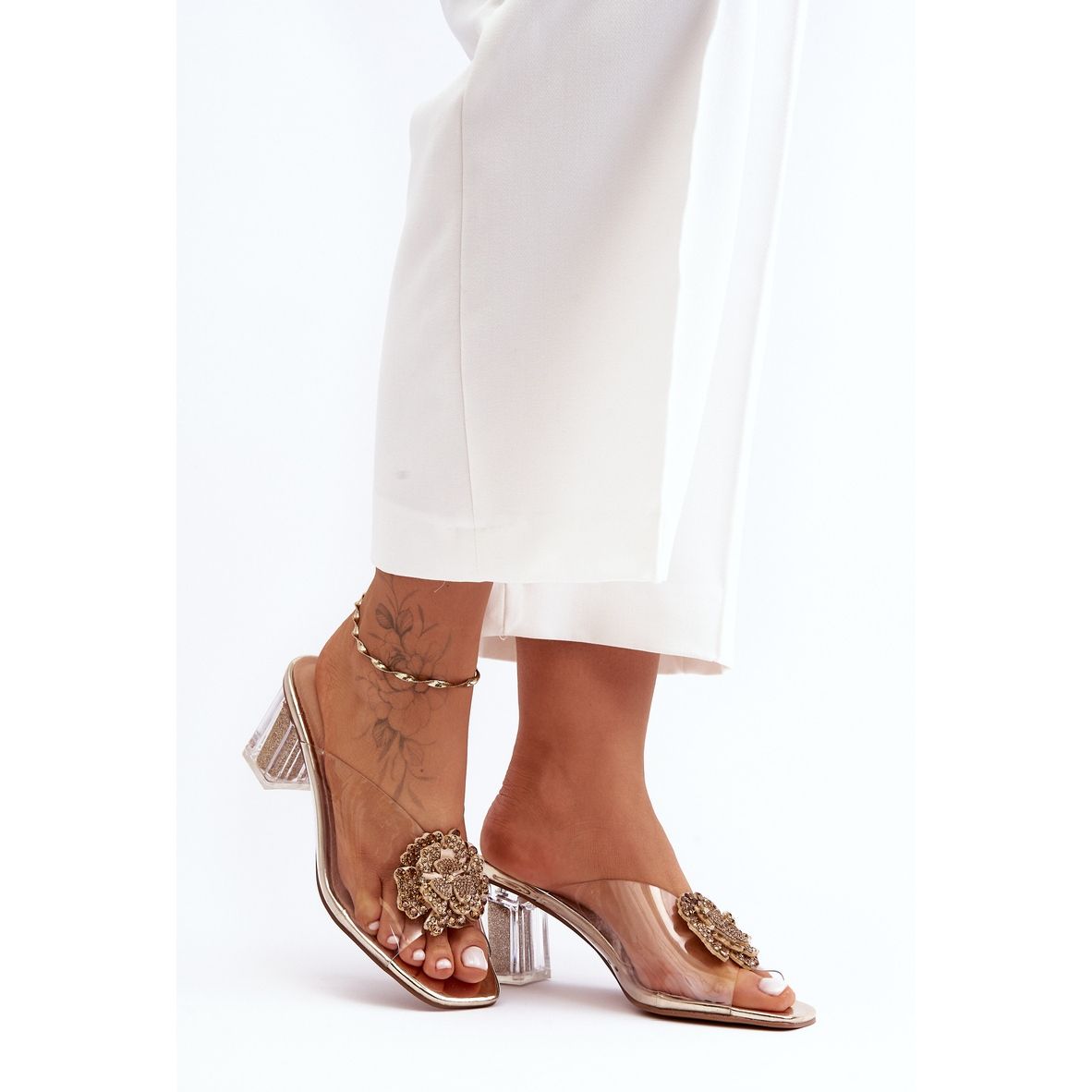 Transparente Hausschuhe mit hohem Absatz und Goldverzierung S.Barski MR1037-20 sind die Quintessenz des femininen Stils und vereinen Luxus, Komfort und einzigartiges Design. Wenn Sie auf der Suche nach Schuhen sind, die sowohl eine schöne Fußdekoration als auch ein bequemer Begleiter für Sommertage sind, sind diese zehenstegsandalen die perfekte Wahl.