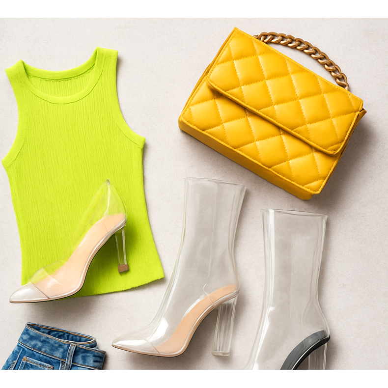 • Neon -Outfit + transparente Absätze: Gleichgewicht der Intensität