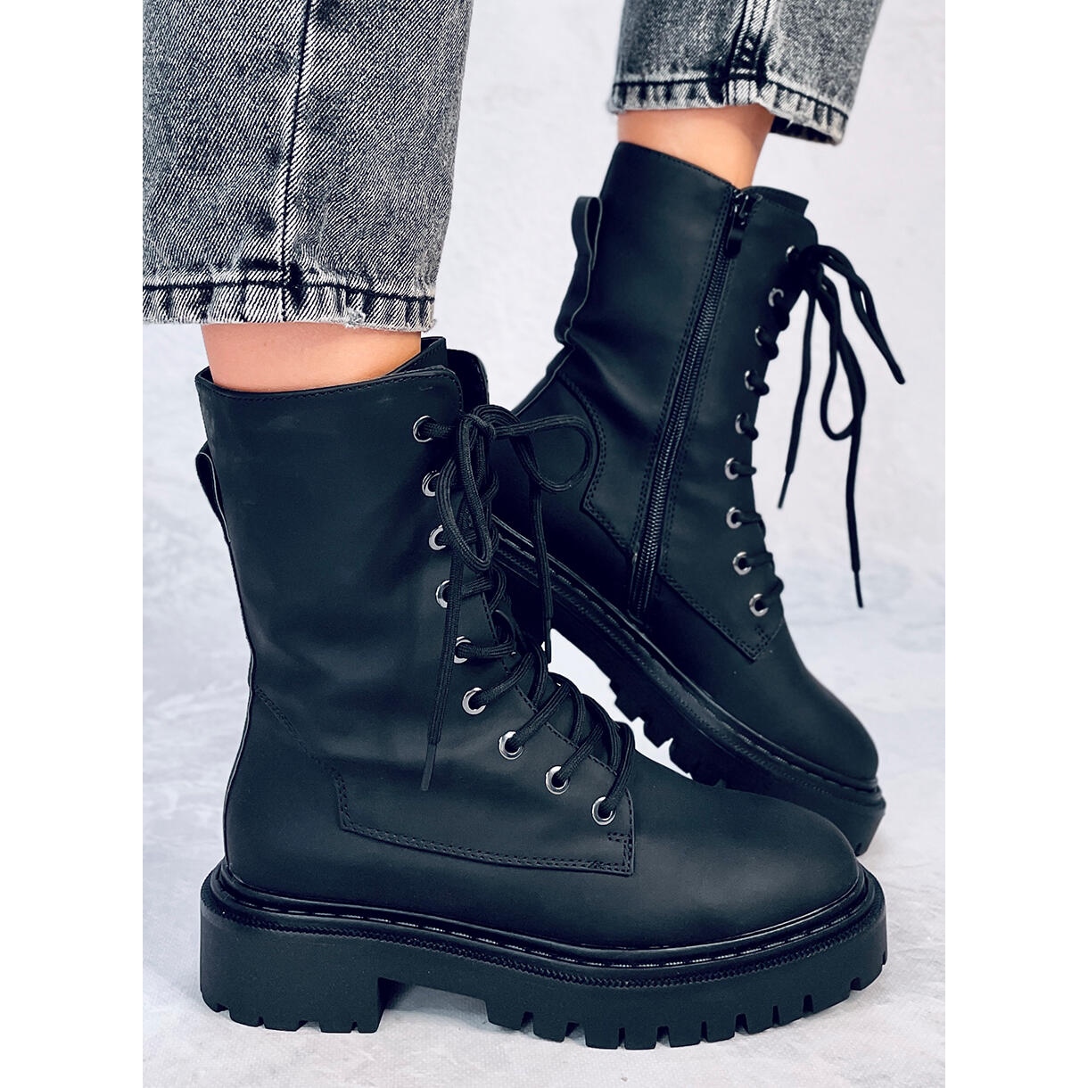 Die klassische Schnürung ermöglicht eine individuelle Anpassung an die Fußweite, während der Reißverschluss an der Seite des Obermaterials ein einfaches An- und Ausziehen ermöglicht. Diese schwarzen Stiefel mit 3,5 cm hohem, flachem Absatz eignen sich perfekt für den Alltag und verleihen ihnen einen militärischen Touch. Dank der Isolierung in Form von zartem Fell sind sie die perfekte Wahl für kältere Tage.