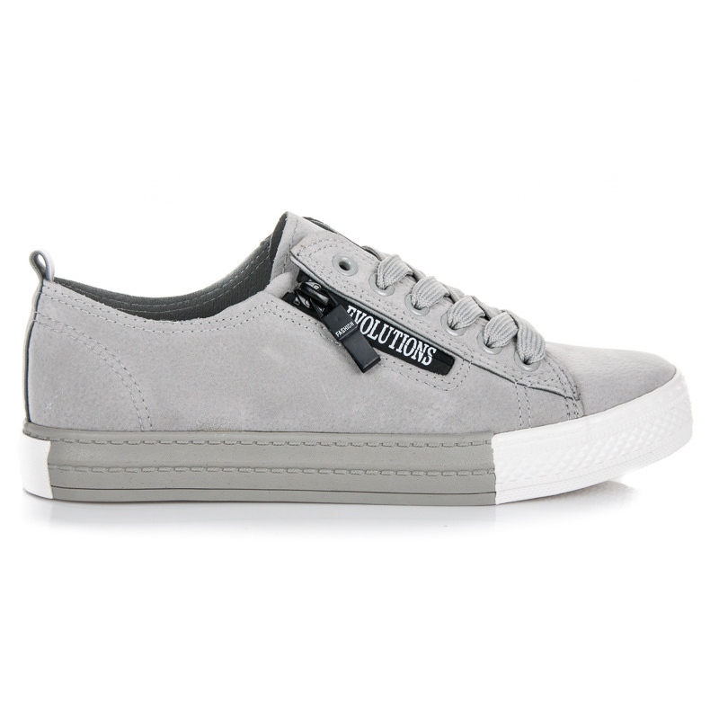 Der Stoffeinsatz garantiert ausreichende Atmungsaktivität und Tragekomfort den ganzen Tag. Graue Plateau-Sneaker sind ein äußerst universelles Angebot, das perfekt zu Jeans, einem Rock oder sogar einem Kleid passt.
