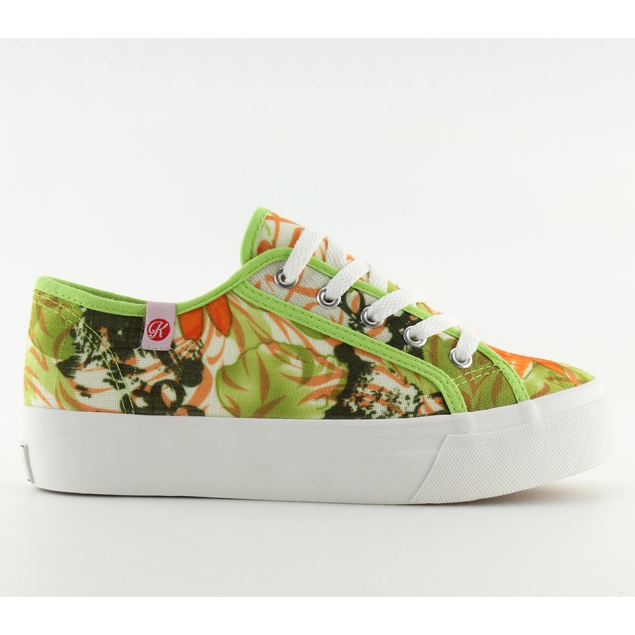 K145403 Mehrfarbige Sneakers mit dicker Sohle – grün, die Komfort mit einem modischen Look verbinden. Niedrige Schnürsneaker auf einem auffälligen, 3 cm hohen weißen Plateau sind ein perfektes Angebot für jeden Tag – für die Arbeit, für einen Spaziergang oder ein Treffen mit Freunden. Ein zartes, florales Muster und die saftige grüne Farbe verleihen jedem Styling Leichtigkeit und Frische.