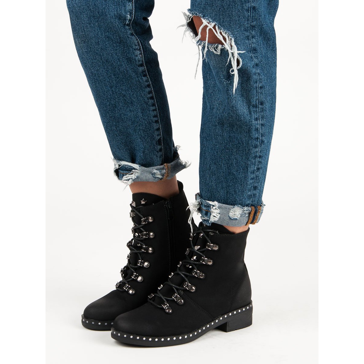 VINCEZA Baggers sind eine Kombination aus Klassik und Moderne – der Reißverschluss und die Schnürung erleichtern das Anziehen und die Details in Form von dekorativen silbernen Nieten und Strasssteinen verleihen ihnen Charakter. Der 4 cm hohe flache Absatz macht diese Schuhe nicht nur stilvoll, sondern auch den ganzen Tag über bequem.