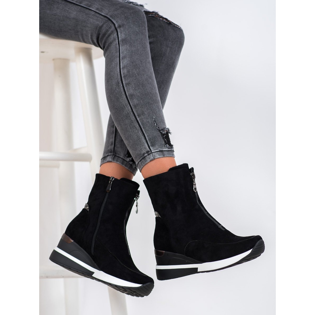 Durch die Absatzhöhe von 6 cm sind die Stiefel dank der Keilkonstruktion ein paar Zentimeter höher, ohne auf Komfort zu verzichten. Der Zierreißverschluss ist ein eindrucksvolles Zierelement, das diese Schuhe von anderen unterscheidet.