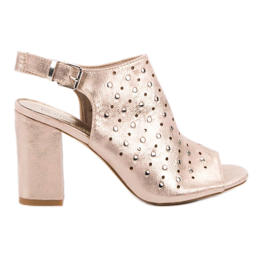 Dies sind Vinceza-Sandalen mit Strasssteinen, die mit Sicherheit die Aufmerksamkeit jeder Frau auf sich ziehen werden. Diese eleganten Schuhe aus wunderschönem gelben Stoff zeichnen sich nicht nur durch ihr ungewöhnliches Aussehen aus, sondern auch durch originelle Details wie metallische Strasssteine und ein durchbrochenes Muster.