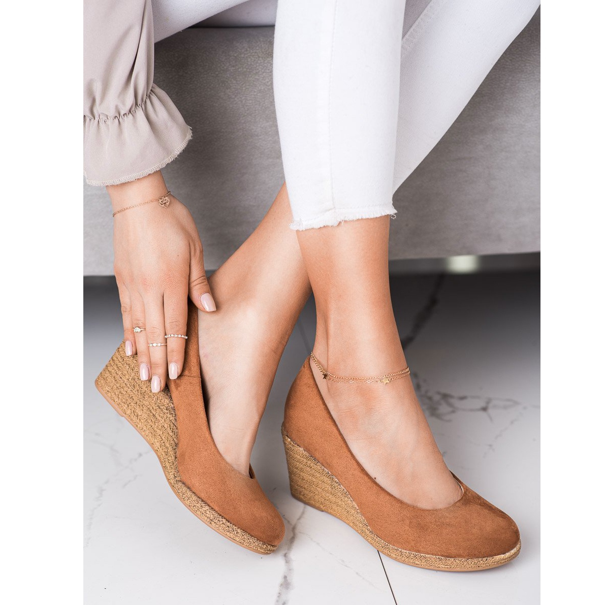 Ein hohes Plateau mit 7-Zentimeter-Keil macht die Silhouette schlanker und erhöht zusätzlich die Stabilität. Eine Sohle mit Profil aus synthetischem Material sorgt für guten Halt und Sicherheit auf verschiedenen Untergründen. Das Innere des Schuhs ist mit einem Naturledereinsatz ausgekleidet, der noch mehr Komfort garantiert und ein längeres Tragen ohne Beschwerden ermöglicht.