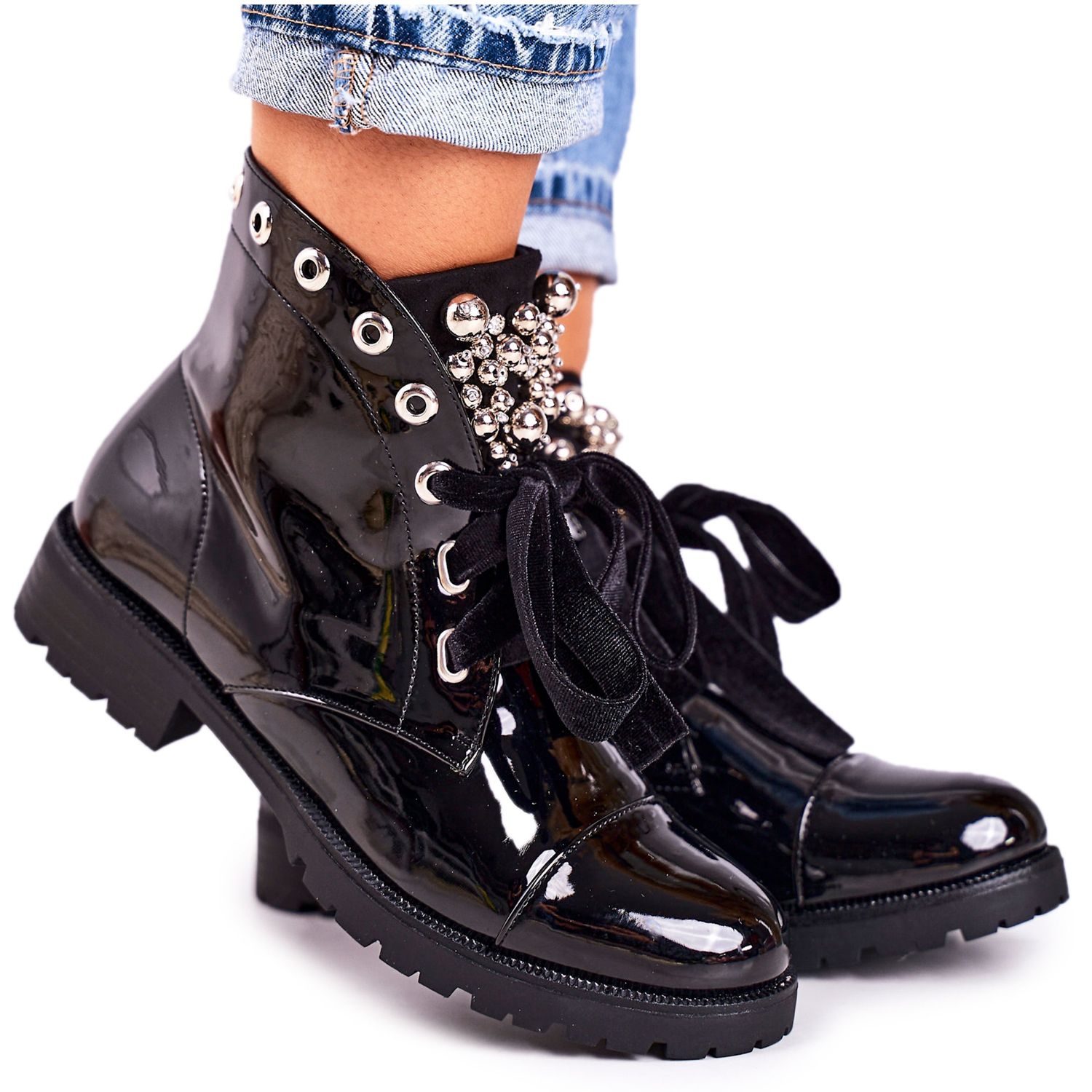 Details: MSMG Warme Damenstiefel mit Metallic-Perlen und Schleife, lackiert Perla schwarz