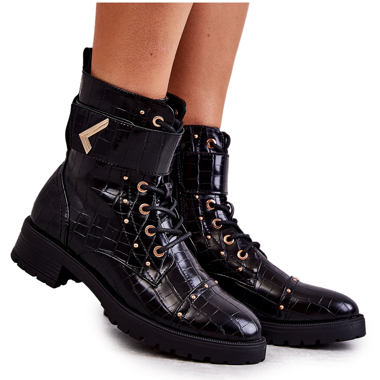 Das klassische Design der Schuhe mit Schnürung und praktischem Verschluss an der Seite des Obermaterials verleiht Eleganz und erleichtert das Anziehen. Ein dekorativer Klettverschluss und Strassdetails heben sie von anderen Modellen ab und verleihen ihnen einen modischen Charakter. Der niedrige und stabile 4-cm-Absatz macht die Stiefel äußerst bequem – perfekt sowohl für das Alltags-Styling als auch für formellere Anlässe.