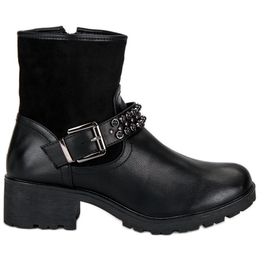Die Innenseite der Stiefel ist mit warmem Schaffell gefüttert, was sie zu einer perfekten Wahl für kalte Tage macht. Dank der immer im Vordergrund stehenden schwarzen Farbe lassen sich diese Worker-Modelle problemlos mit verschiedenen Stilrichtungen kombinieren – von lässig bis elegant. Eine dekorative Schnalle und Details mit Strasssteinen verleihen Charakter, und die niedrige Absatzhöhe (5 cm) sorgt für Komfort den ganzen Tag.
