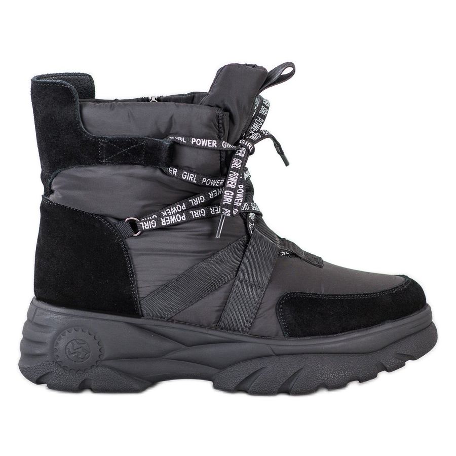 Schwarze Schneestiefel passen perfekt zu verschiedenen Stilen und sind daher die ideale Wahl sowohl für alltägliche Ausflüge als auch für weniger formelle Meetings. Sie zeichnen sich durch einzigartige Details aus, wie zum Beispiel Schnürsenkel mit interessanten Inschriften, die Charakter und Originalität verleihen.