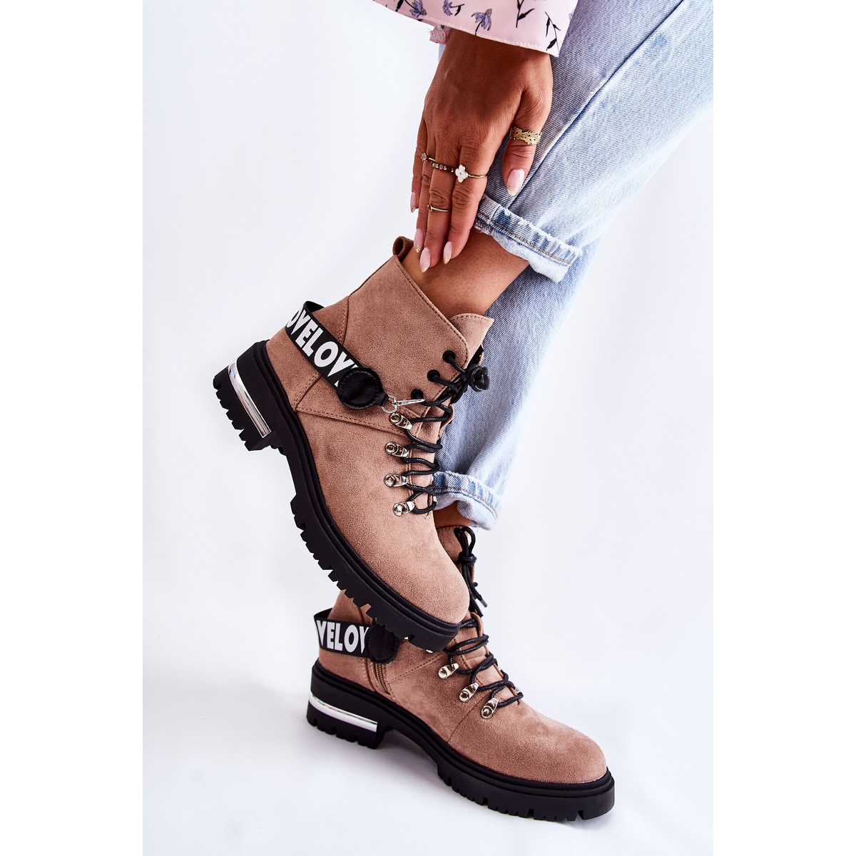 Die Stiefel sind mit einer versteiften Ferse und einem klassischen Riegel ausgestattet, der für eine gute Passform am Fuß sorgt. Zusätzlich befindet sich seitlich am Obermaterial ein praktischer Reißverschluss, der das An- und Ausziehen der Schuhe erleichtert. Der abnehmbare Riemen mit Aufschrift ist ein origineller Akzent, der den Schuhen einen einzigartigen Charakter verleiht.