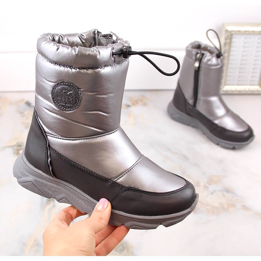 Wasserdichte Mädchen -Schneestiefel kornecki 6916 - Silber, die Stil und Funktionalität kombinieren. Perfekt für Wintertage - Ein glänzender silberner Look mit schwarzen Accessoires passt gut zu lässigen und eleganteren Kostümen. Modell aus der Kollektion Black Friday 2024.