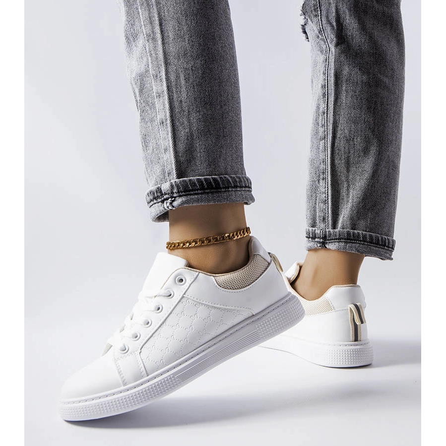 Klassische Turnschuhe für weiße Frauen, die problemlos in jeden Sommerstilisierung passen. Das ökologische Leder -Obermaterial wurde mit Prägung und einer subtilen beige Befestigung dekoriert, die den Schuhen den Charakter verleiht, ohne ihre Einfachheit zu stören. Sie mischen sich gut mit Jeans, einem leichten Kleid oder einem Maxirock - im Sommer werden sie die Bräune betonen und den ungezwungenen Look ergänzen.