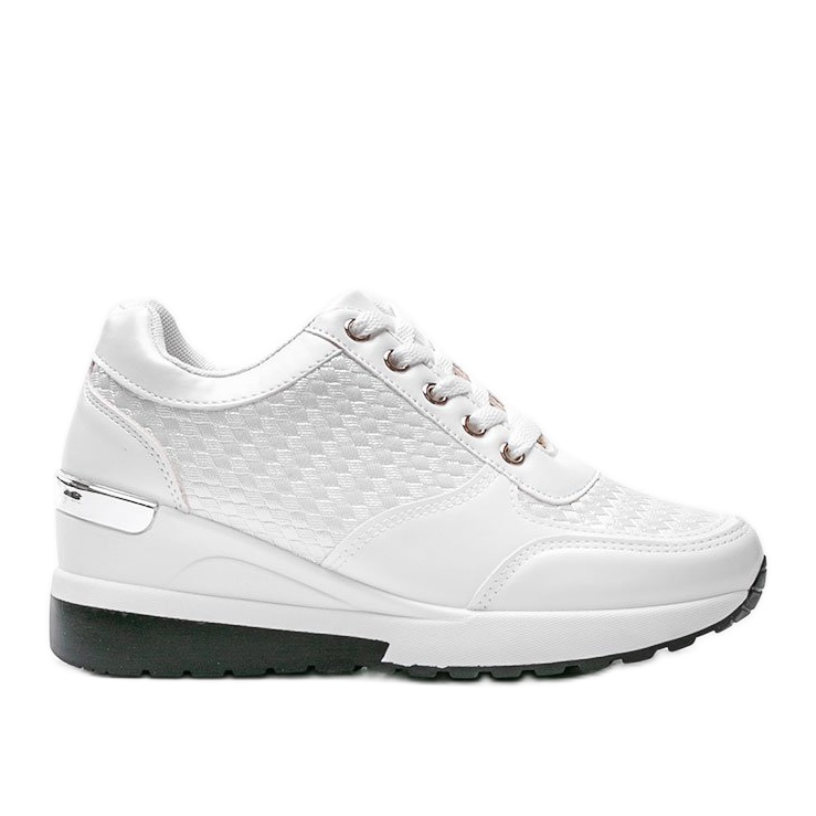 Dies sind weiß glänzende Mara-Wedge-Sneaker – die perfekte Wahl für moderne Frauen, die Wert auf Stil und Komfort legen! Diese einzigartigen Schuhe der Marke Inna vereinen Eleganz und einen lässigen Charakter. Die aus hochwertigem Faux-Wildleder gefertigten Sneaker fallen durch eine dezente, glänzende Prägung und einen auffälligen Metallic-Einsatz auf der Rückseite der Sohle auf.