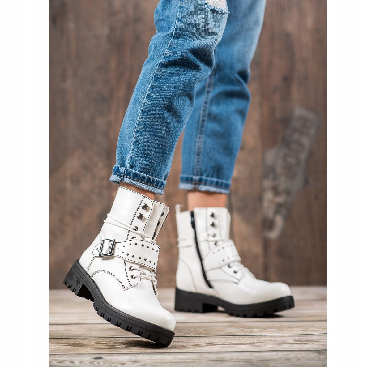 Sie bestehen aus hochwertigem ökologischem Leder und sorgen für Langlebigkeit und Komfort. Die dekorative Schnalle und die Strasssteine verleihen ihnen Charakter und unterstreichen ihren einzigartigen Stil. Die schwarze, dicke Sohle kontrastiert perfekt mit der weißen Farbe des Obermaterials und ergibt ein harmonisches Ganzes.