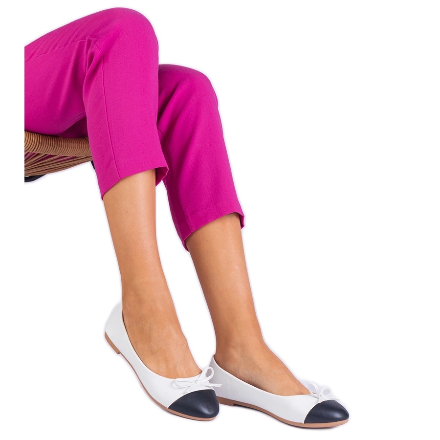 Weiße Ballerinas, hergestellt aus hochwertigem ökologischem Leder und erfreuen sich vor sorgfältiger Leistung und Liebe zum Detail. Ein zartes Bogen auf der Vorderseite fügt einen charmanten Charakter hinzu, und die kontrastierende schwarze Nase führt zu einer Notiz der Ausdruckskraft. Dank der Einführung ist das Anlegen und Entfernen von Schuhen schnell und komfortabel, und eine flache Ferse mit einer Höhe von 1 cm sorgt den ganzen Tag über Stabilität und Komfort.