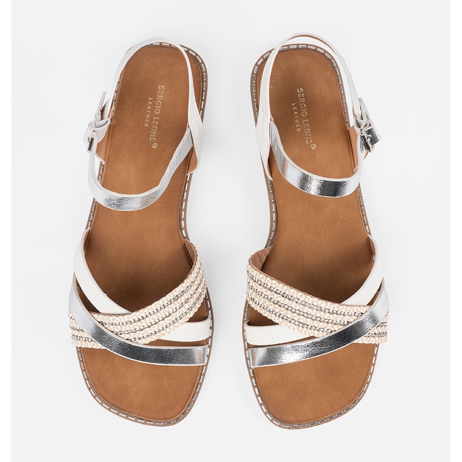 Dieses Modell hat eine flache Ferse mit einer Höhe von 1,5 cm, wodurch es bequem zu tragen ist. Das subtile metallische Finish verleiht den Sandalen einen einzigartigen Charakter, und die Schnalle -Befestigung erleichtert das Anziehen und Abziehen. Die offene Nase ist ideal für heiße Tage, und die weiße Farbe in Kombination mit silbernen Akzenten macht die Sandalen universell und passt zu verschiedenen Stilen - sowohl lässig als auch eleganter.