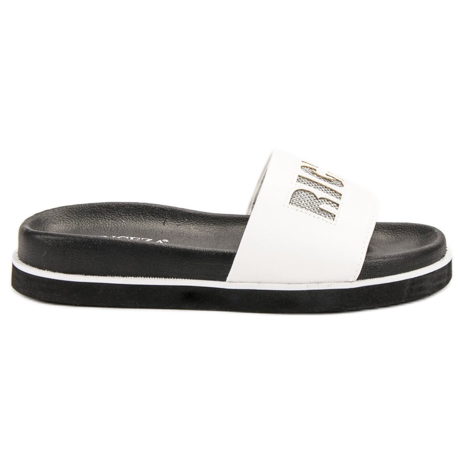 Machen Sie sich bereit für den kommenden Sommer mit den riesigen zehenstegsandalen von Vinceza, die zu einem untrennbaren Element Ihrer Urlaubsgarderobe werden. Ihre minimalistische, weiße Farbe lässt sich perfekt mit verschiedenen Stilen kombinieren und die Aufschrift „RICH“ verleiht Charakter und Originalität.