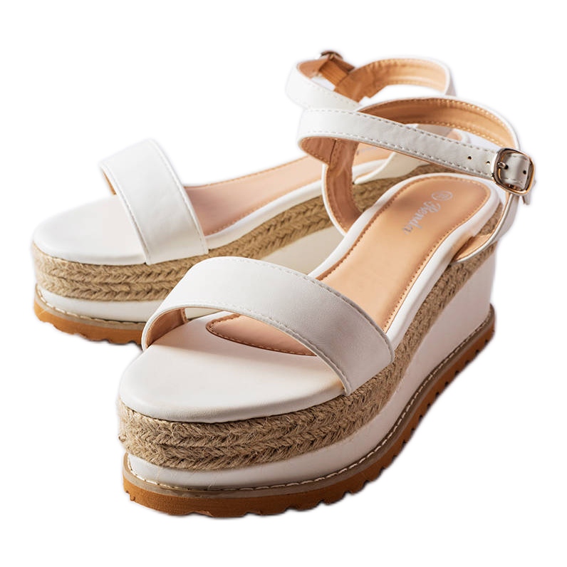 Elegante, universelle und komfortable Sandalen auf dem Keil sind ein Must-Have-Urlaubsgarderobe. Ein klassischer Schnitt mit Gürtel und Schnalle, eine modulare Plattform mit einer Höhe von 7 cm und hellen, neutralen Farben (weiß mit einer beigen Sohle) machen das Modell perfekt zu sowohl Kleidern als auch Ihre Lieblingsjeans.