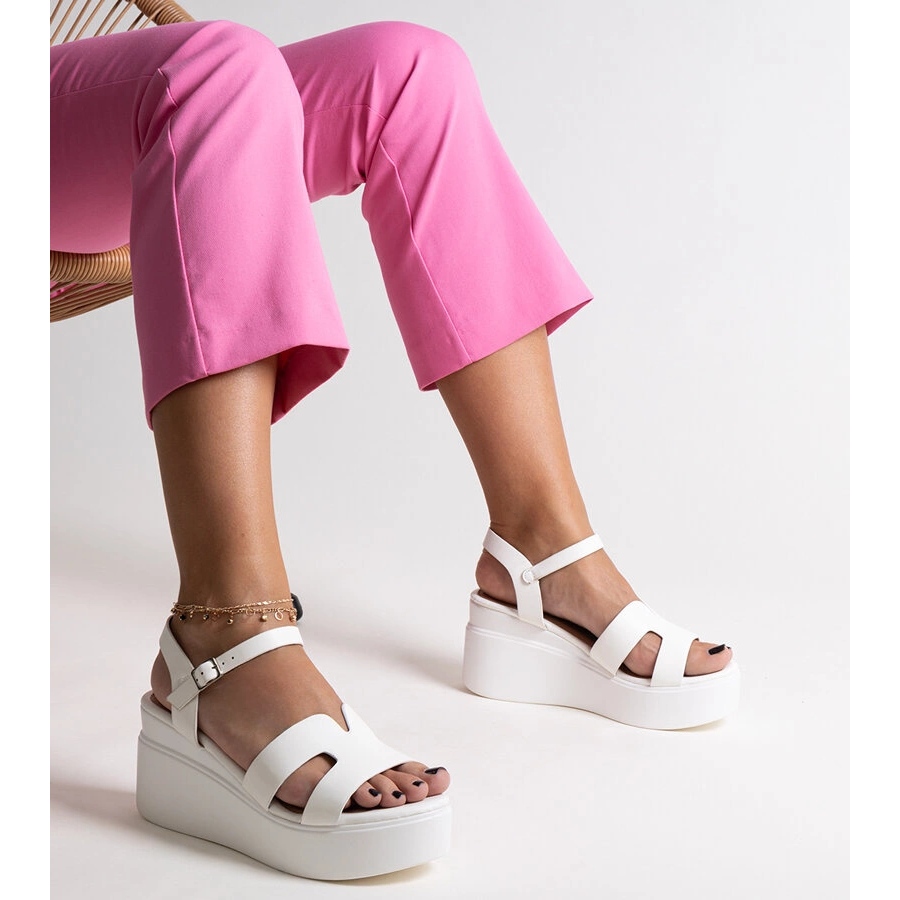 Reema -Sandalen haben einen Keil von 7,5 Zentimeter, der beim Gehen Komfort gewährleistet und gleichzeitig die Beine optisch verlängert. Das Fehlen einer Nase und einer Schnalle -Befestigung garantiert den Kauf und passt zum Fuß. In White passen sie perfekt in Sommertrends und ermöglichen es Ihnen, sich frei mit verschiedenen Stilisierungen zu verbinden.