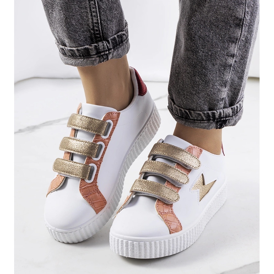 Weiße Turnschuhe Pitmerden (Modell M-973)-Eine ideale Basis für Sommer, Freizeitstilisationen. Das obere aus hochwertige ökologische Leder in klassischem Weiß wurde mit rosa Einsätzen im Thema der Schlange variiert, die den Schuhen einen stilvollen, femininen Charakter verleihen. Niedrig, komfortabel und praktisch - jeden Tag großartig.