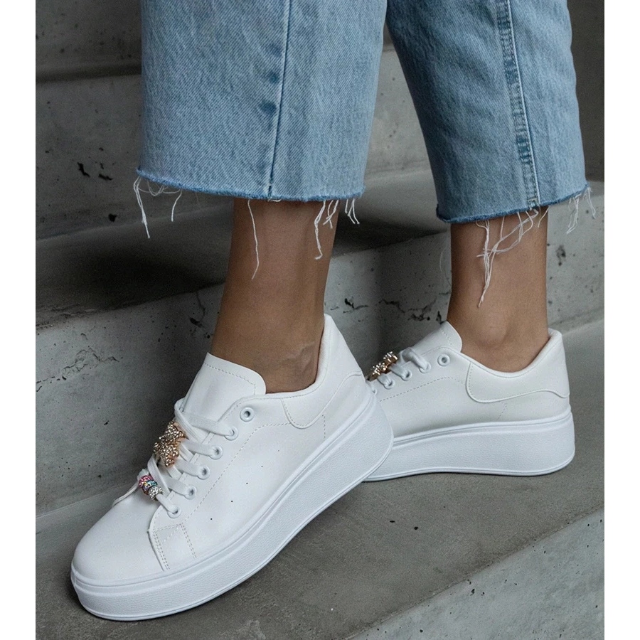 Diese Turnschuhe sind nicht nur mit einer klassischen, weißen Farbe, sondern auch einer effektiven, dicken dekorativen Kette, die zum absoluten Hit der Saison geworden ist. Dank dieses Details fügen Turnschuhe den Charakter jeglicher Stylisierung hinzu, sei es täglich oder zu formelleren Anlässen.