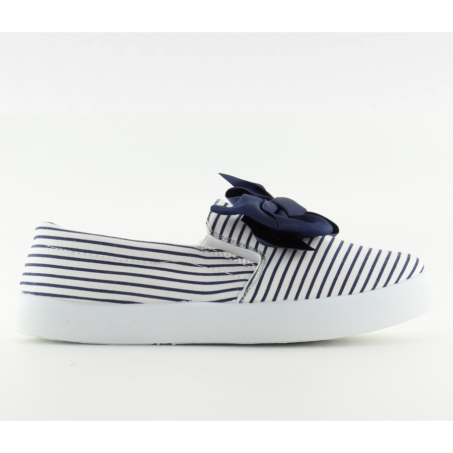 Matrosen-Slipper B860 weiß/marineblau – leichte Sommer-Sneaker im Matrosen-Stil, perfekt für Urlaubsspaziergänge und Alltags-Styling. Komplett aus Stoff gefertigt, begeistern sie mit einer klassischen Kombination aus Weiß und Marineblau und einer dekorativen Schleife, die für einen femininen Charakter sorgt. Die weiße, sportliche Sohle (Plateau-/Absatzhöhe 2,0 cm) unterstreicht den lässigen Stil und sorgt für alltäglichen Komfort.