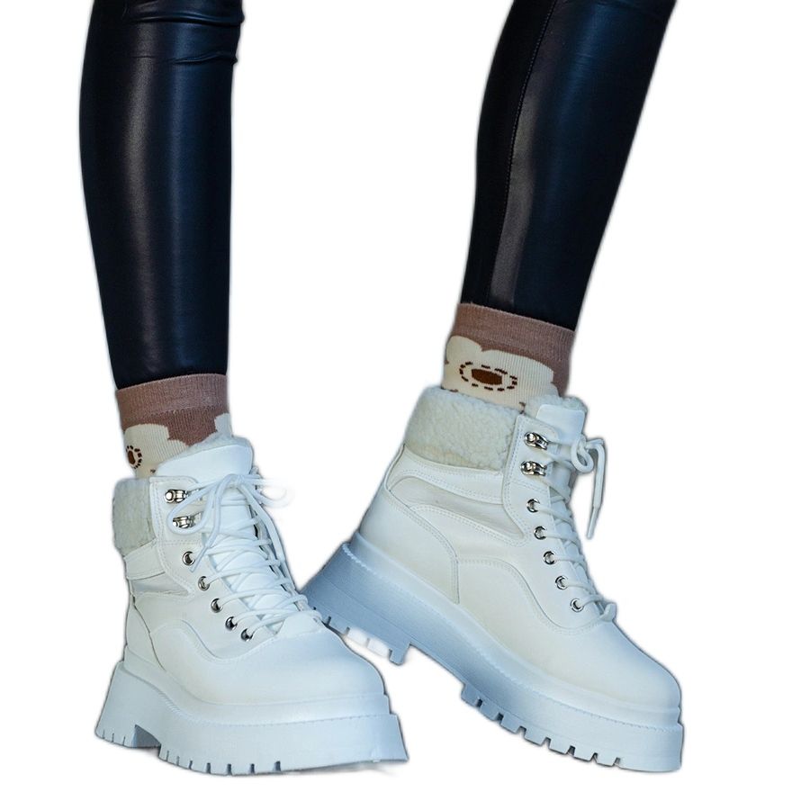 Weiße Trapper auf einer dicken Sohle mit dem besten, um in jedem Kleiderschrank-Modeliebhaber das Must-Have-Pelz zu haben! Diese stilvollen Schuhe erfreuen sich nicht nur mit ihrem Aussehen, sondern bieten auch an kühleren Tagen außergewöhnliche Komfort und Wärme.