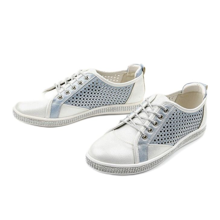 Delikate, weibliche Turnschuhe PA1 A18-6252 kombinieren eine klassische Form mit subtilen Dekorationen. Sie bestehen aus hochwertigem ökologischem Leder, in weißem, blauem Akzenten auf dem Obermaterial und zeichnen sich durch eine offene Textur und eine feste weiße Sohle aus, die mit Zirkonen dekoriert ist. Silver Schnürsenkel geben ihnen einen glänzenden Akzent. Niedrig, komfortabel und universell - täglich großartig.