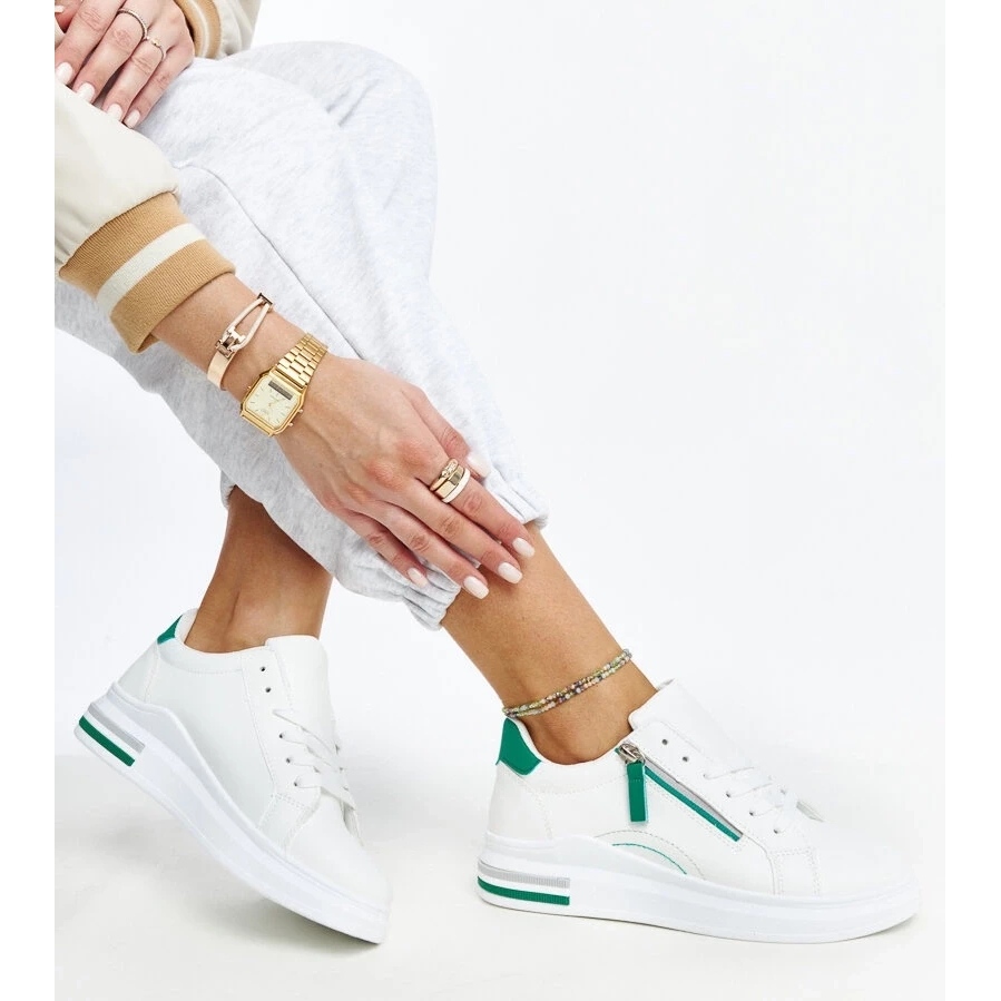 Weiße Turnschuhe mit grünen Anaunia -Einsätzen von D/GMR sind die perfekte Wahl für Frauen, die Stil und Komfort schätzen. Diese Turnschuhe unterscheiden sich nicht nur durch modisches, minimalistisches Design, sondern auch durch die hohe Qualität der verwendeten Materialien. Sie passen sich treu an das Bein an und gewährleisten den Komfort, den ganzen Tag zu tragen.
