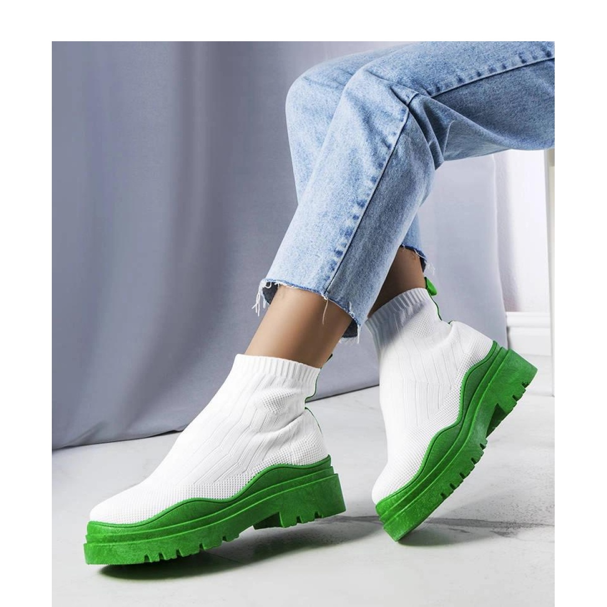 Details: Weiße Sock Boots mit grüner Sohle