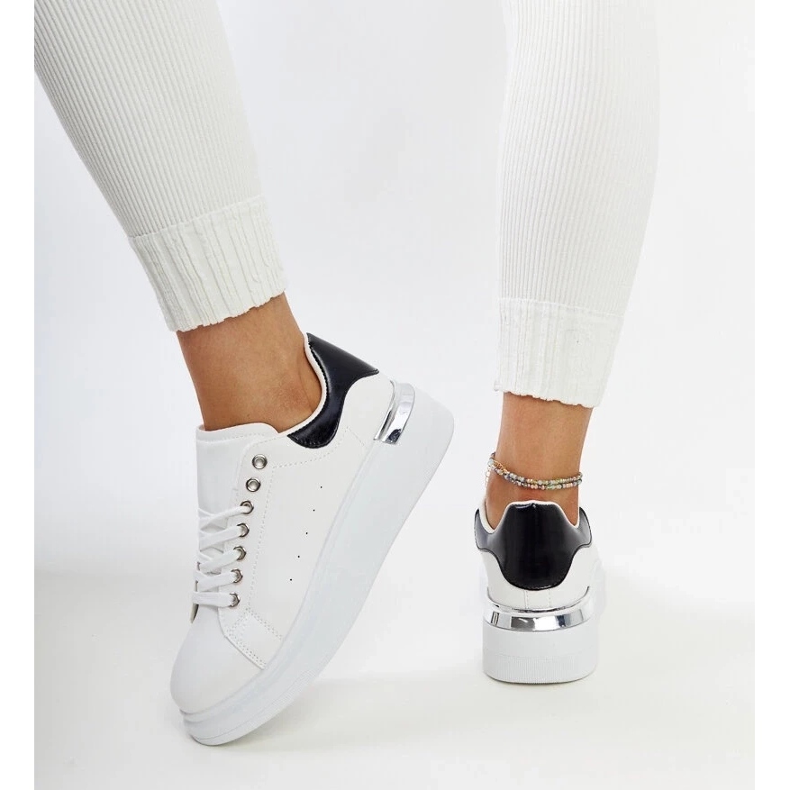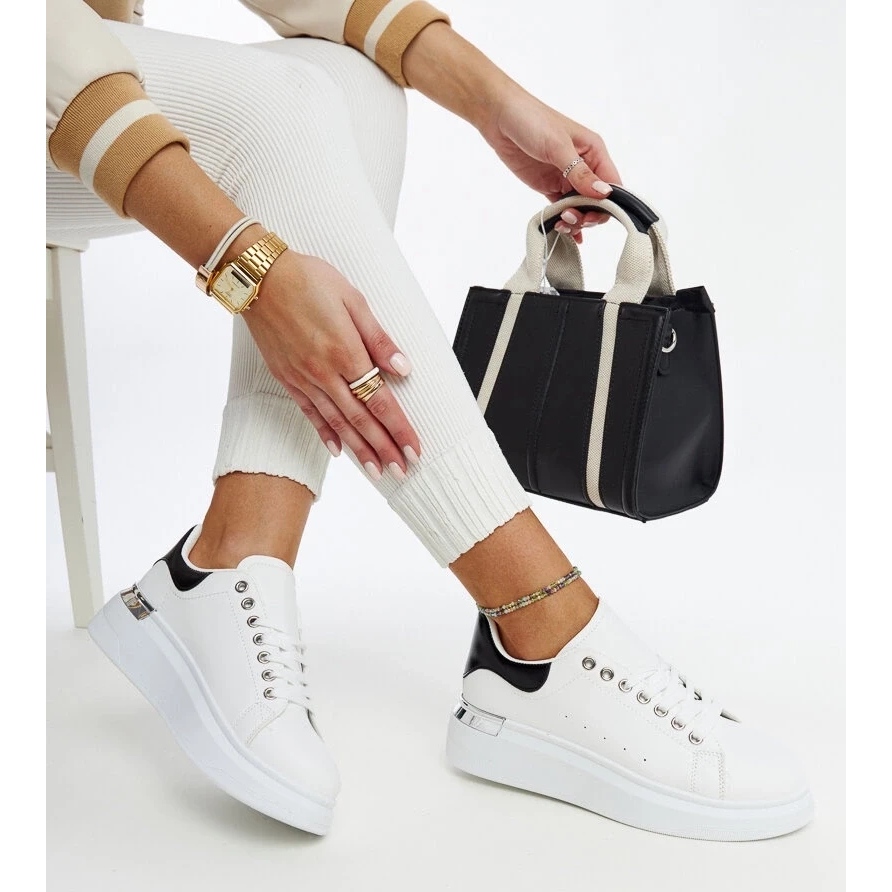 Weiße Sportschuhe mit einer schwarzen Meriana -Marke D/GMR -Einsatz sind die perfekte Wahl für Frauen, die sowohl Stil als auch Komfort schätzen. Diese Turnschuhe, die Hurtado mit ihrem modernen Design ihre Augen anzieht, und ihr oberer Teil aus hochwertigem Material passt sich perfekt an den Fuß an und sorgt beim Tragen.