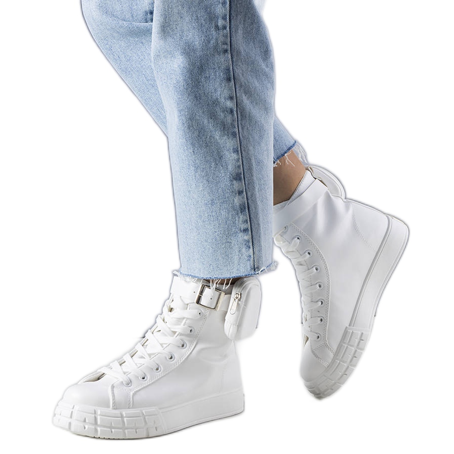 Weiße Knöchel -Turnschuhe mit einem Beutel Willie - müssen in Ihrer Garderobe haben. Der klassische, hoch -ausstehende Schnitt mit einem modischen Sohle -Finish macht dieses Modell perfekt Komfort mit urbanem Stil. Ein praktisches, kleines Beutel, der mit einer Schnalle befestigt ist - perfekt für Schlüssel, klein oder karte ist an das Paar befestigt. Das obere ökologische Leder garantiert einen eleganten Look ohne Kompromiss aus Bequemlichkeit.