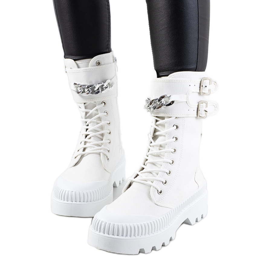 Wir präsentieren weiße Sneaker mit Kette, Modell Taus – äußerst stylische und bequeme Schuhe, die jedes Sommer-Styling perfekt ergänzen. Die hohe Traktorsohle sorgt nicht nur für einen modischen Look, sondern auch für hervorragenden Halt und Tragekomfort.