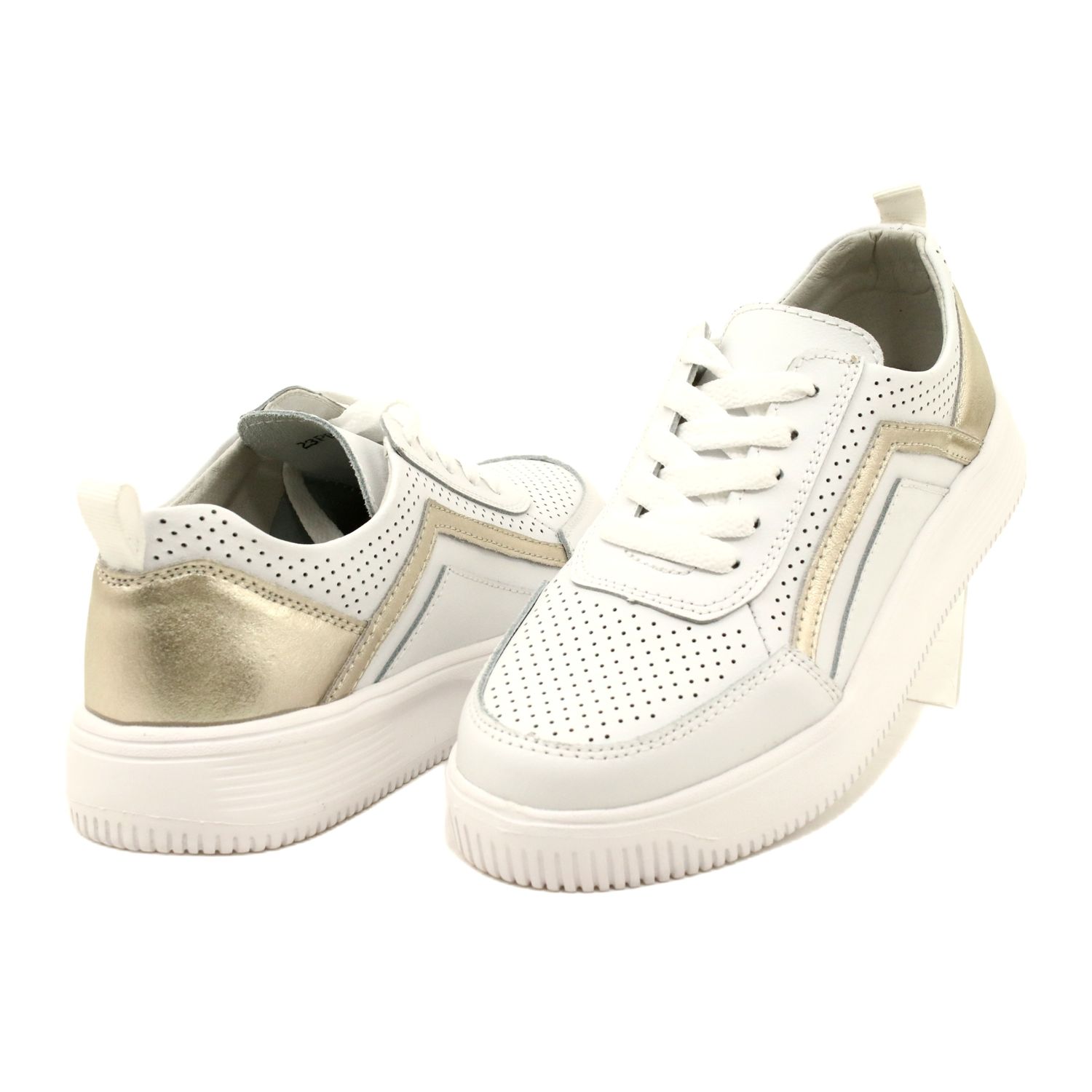 Extrem weibliche, sportliche Evento -Turnschuhe in einer klassischen weißen Farbe mit goldenen Akzenten. Kombinieren Sie mit natürlichen Leder, die auf einer 3,5 -cm -Plattform eingestellt sind, einen stilvollen Look mit täglichem Komfort. Das openwork -Ober- und Ledereinsatz lüftet eine gute Belüftung und eine perfekte Passform zum Fuß, und die leichte Sohle mit EVA mit Profil verleiht die Elastizität und Stabilität jedes Schritts. Klassische Schnürung und ein runder Zeh ergänzen die universelle Natur der Schuhe.
