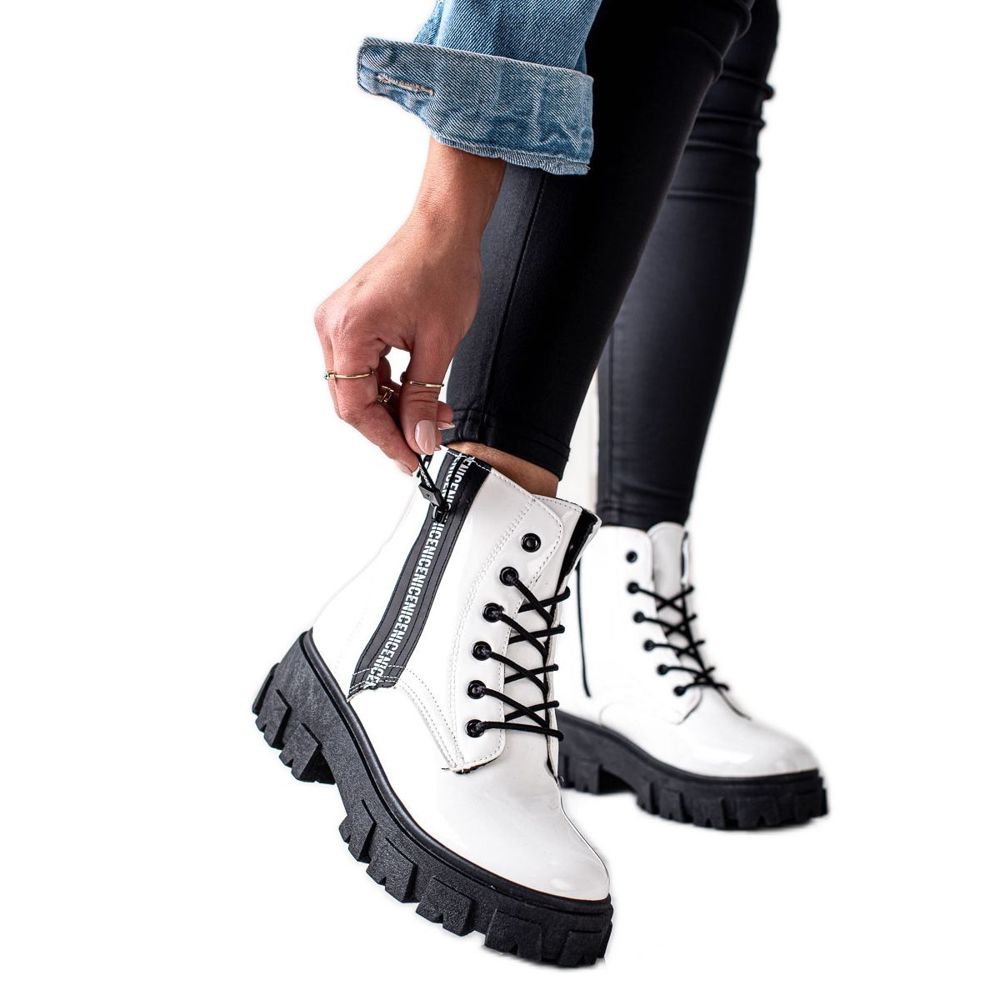 Ihr elegantes, weißes Obermaterial aus ökologischem Leder imitiert klassisches Leder und der dekorative Reißverschluss verleiht ihm einen einzigartigen Charakter. Dank eines flachen 5 cm hohen Absatzes und eines 3,5 cm hohen Plateaus bieten diese Worker auch an einem langen Tag ausreichend Tragekomfort. Durch die runde Spitze und die Schaftweite von 24 cm passen sich die Schuhe perfekt den Beinen an.