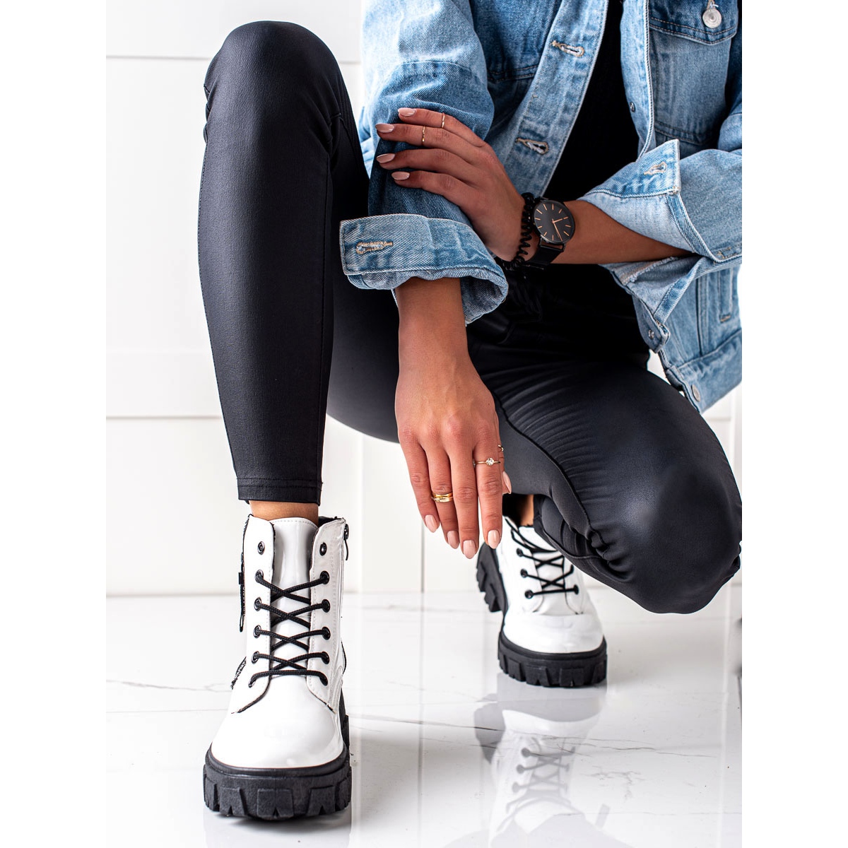 Wir präsentieren weiße Schnür-Plateau-Worker vom renommierten Hersteller TRENDI – die perfekte Wahl für Frauen, die Komfort mit modischem Stil verbinden möchten. Diese Damenstiefel zeichnen sich durch einen geschlossenen, weichen Absatz und eine hervorragende Isolierung aus, was sie zu einem perfekten Begleiter an kälteren Tagen macht.