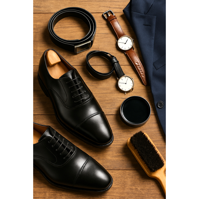 Schuhe sollten mit Gürtel, Uhrenarmband und anderen Lederaccessoires harmonieren. Schwarze Schuhe mit schwarzem Gürtel, braun mit braun.