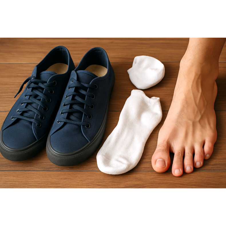 ✗ Schuhe ohne Socken tragen — Schweiß wird direkt vom Material aufgenommen