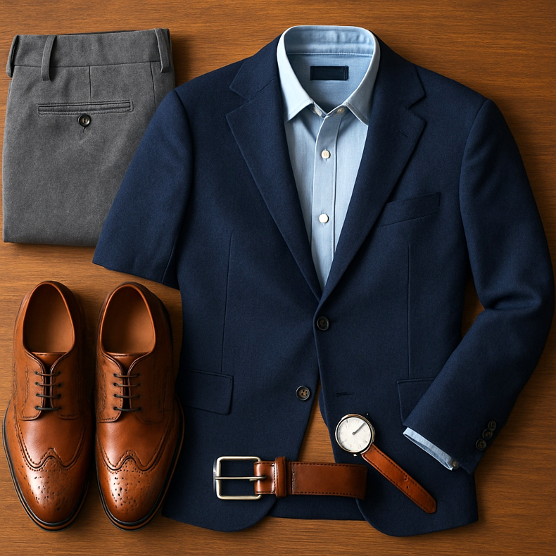 Anzug (keine Krawatte ok) + Hemd + braun/schwarze Oxfords. Minimalistische Uhr.