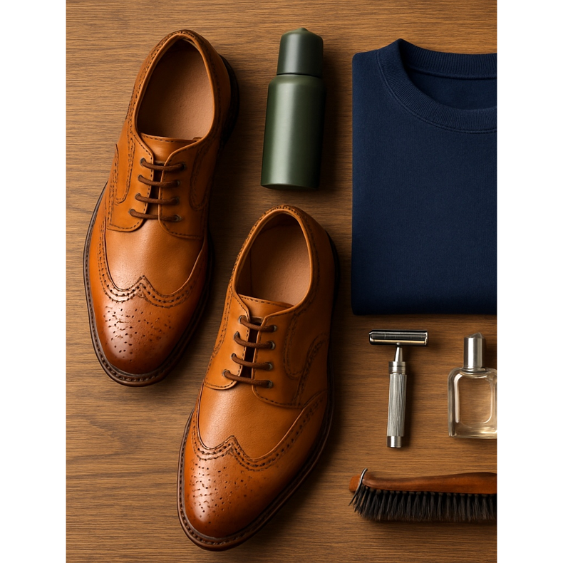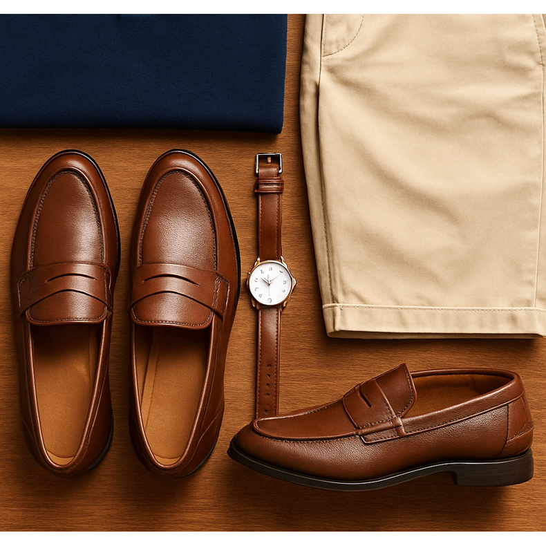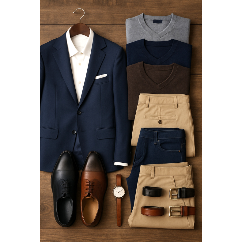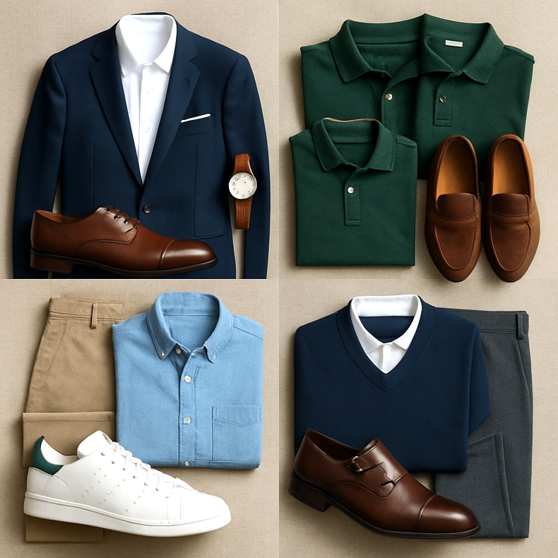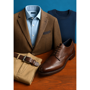 Dunkle Jeans + Polo/Pullover + braune Slipper oder Chelsea-Boots.