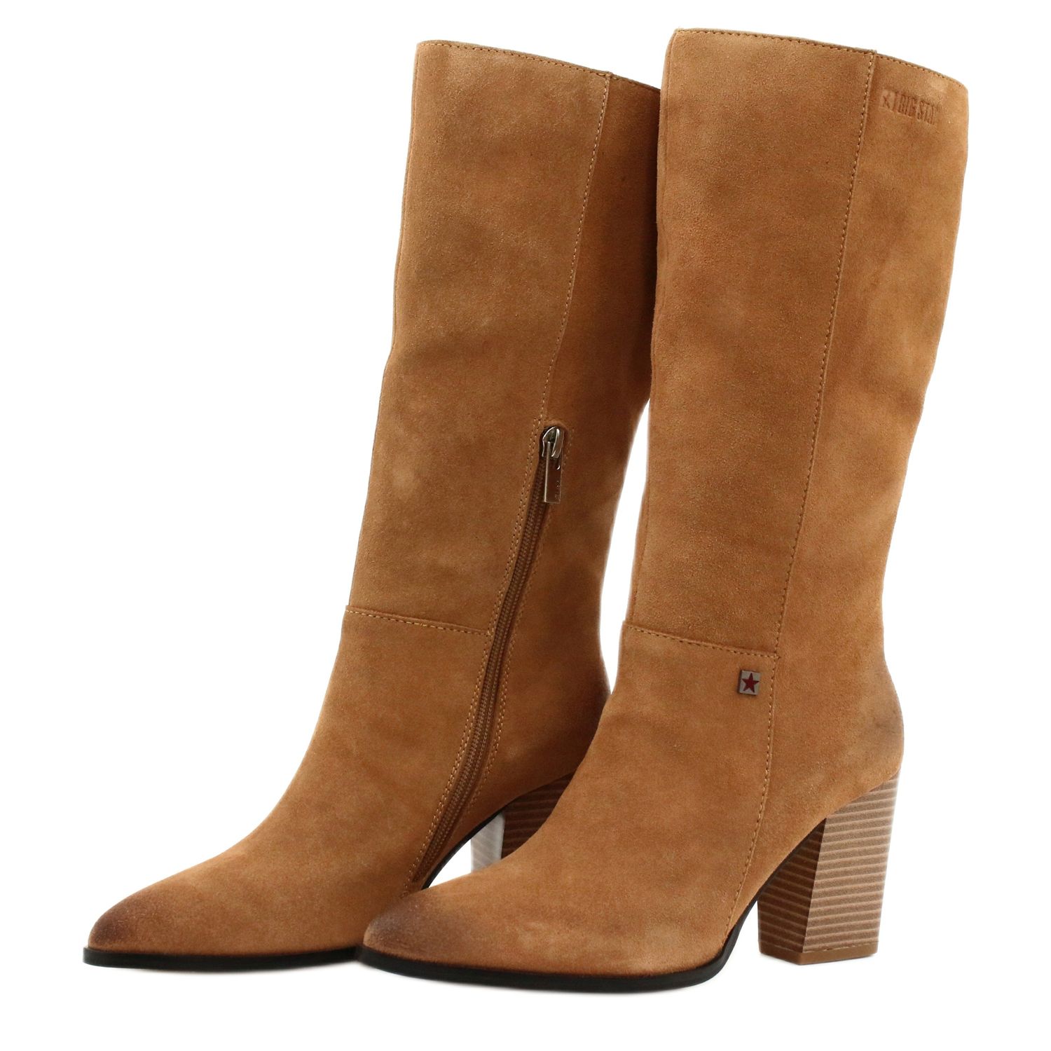 Entdecken Sie die außergewöhnlichen Wildleder-Cowboystiefel Big Star GG274345 im Kamelton, die die perfekte Kombination aus Eleganz und Komfort darstellen. Diese originellen Damenstiefel aus hochwertigem Naturleder mit Wildleder-Finish zeichnen sich durch einen schmalen, wadenlangen Schaft aus, der sich perfekt an die Beinform anpasst und für Stabilität und Komfort sorgt.