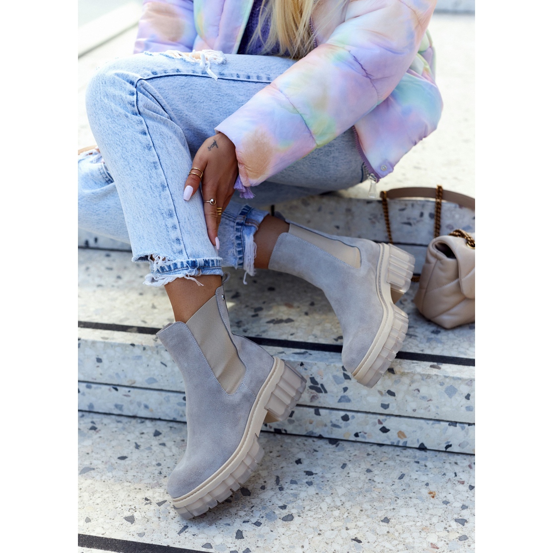Wir präsentieren Wildleder-Arbeiterstiefel für Damen der Marke Lemar in einer modischen hellgrauen Farbe, die eine perfekte Ergänzung zu Ihrer Garderobe sein wird. Diese stilvollen Stiefel zeichnen sich durch ein massives 4 cm hohes Plateau und einen breiten Absatz von 6 cm aus, der Komfort mit einem attraktiven Erscheinungsbild verbindet.