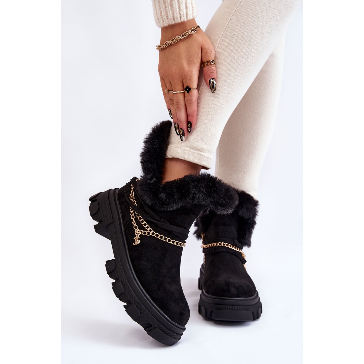 Wir präsentieren außergewöhnliche Damen-Stiefeletten PM1 aus Öko-Wildleder, die Eleganz und Komfort vereinen. Diese schwarzen Stiefeletten mit Zierkette sind die perfekte Ergänzung zu jedem Styling und verleihen ihm einen einzigartigen Charakter. Durch den dekorativen Gürtel und die Kette, die sich leicht abnehmen lassen, lässt sich der Look individuell gestalten, was sie noch universeller macht.