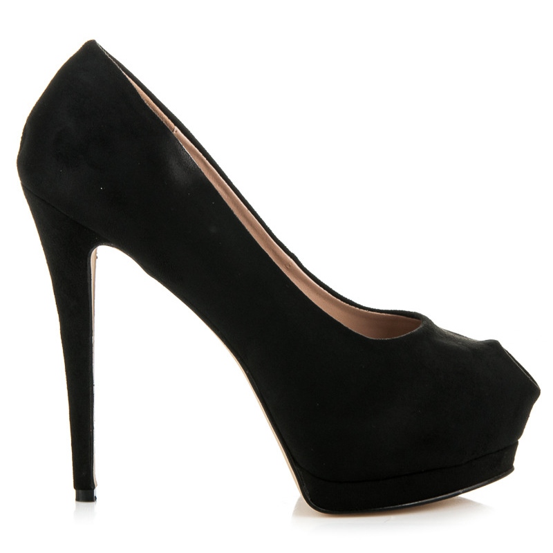 Wir präsentieren elegante schwarze High Heels mit offenem Zehenbereich der Marke Vices, die die perfekte Ergänzung zu jedem Styling sind. Diese Wildlederpumps sind eine Kombination aus Klassik und einem Hauch von Modernität und machen sie zu einem unverzichtbaren Element in der Garderobe jeder Frau.