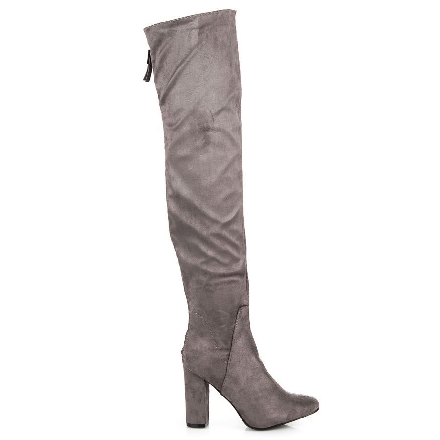 Die Schuhe bestehen aus hochwertigem ökologischem Wildleder, das Tragekomfort und Langlebigkeit garantiert. Ein stabiler 10 cm hoher Absatz und eine glatte Synthetiksohle sorgen für Komfort und formen gleichzeitig die Figur optimal, wodurch die Beine schlanker werden und ihre Vorzüge betont werden. Der hohe Schaft, der bis über das Knie reicht, verleiht Charakter und Eleganz, und die mandelförmige Spitze sorgt für einen subtilen Hauch von Klassik.
