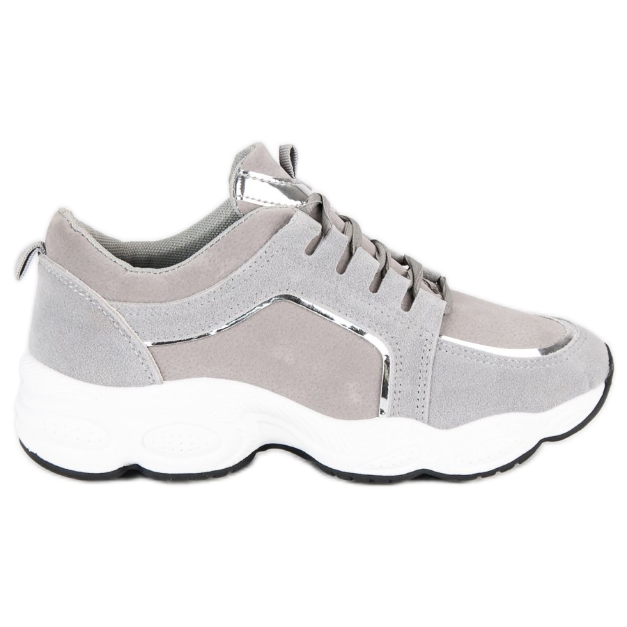 Ihr Design zeichnet sich durch modernen Minimalismus aus und die graue Farbe mit zarten silbernen Einsätzen passt perfekt zu den aktuellen Trends. Die Profilsohle aus Gummi garantiert nicht nur guten Halt, sondern auch Tragekomfort. Darüber hinaus sorgt die Plattformhöhe von 3 cm für etwas Höhe, ohne auf Komfort zu verzichten.